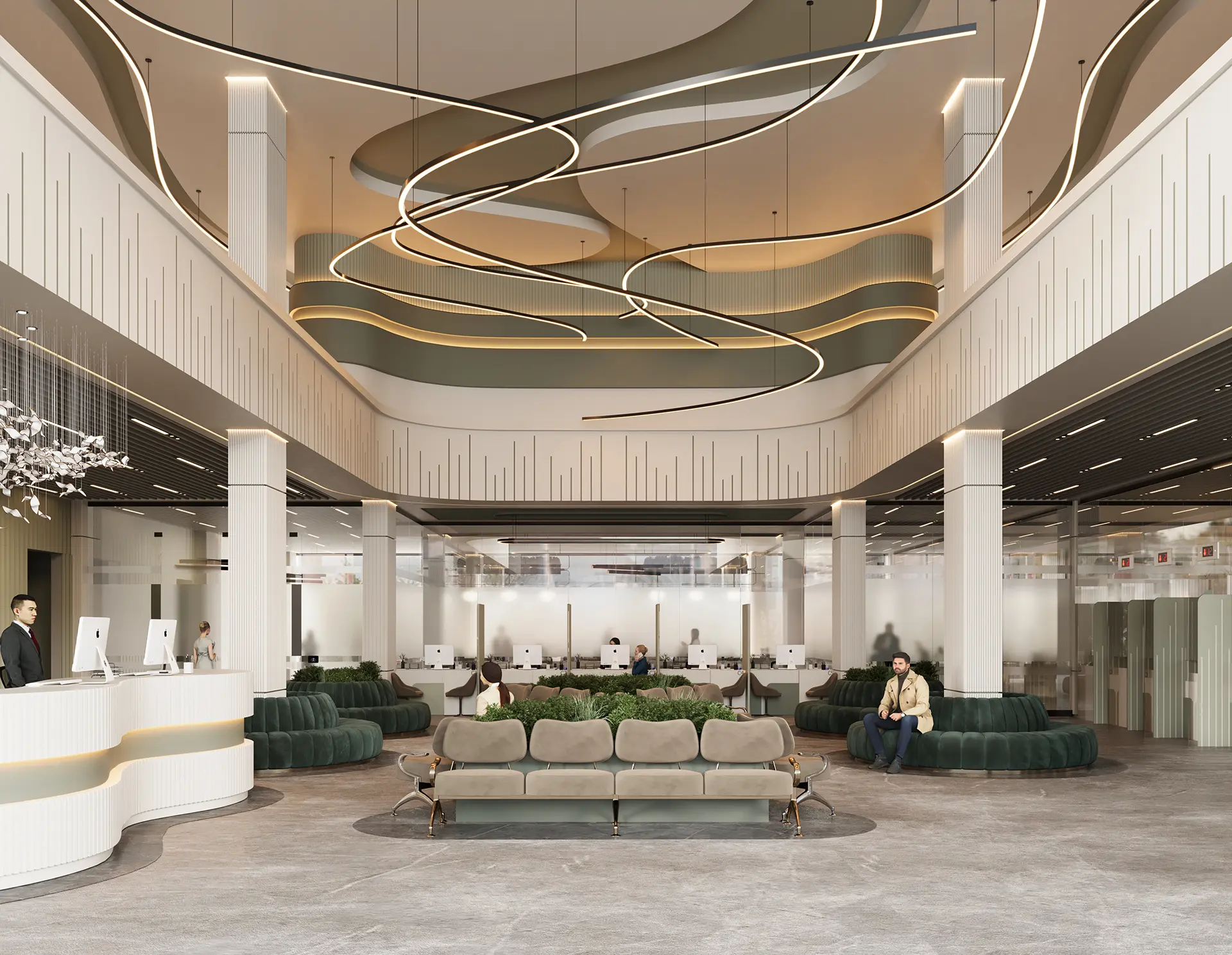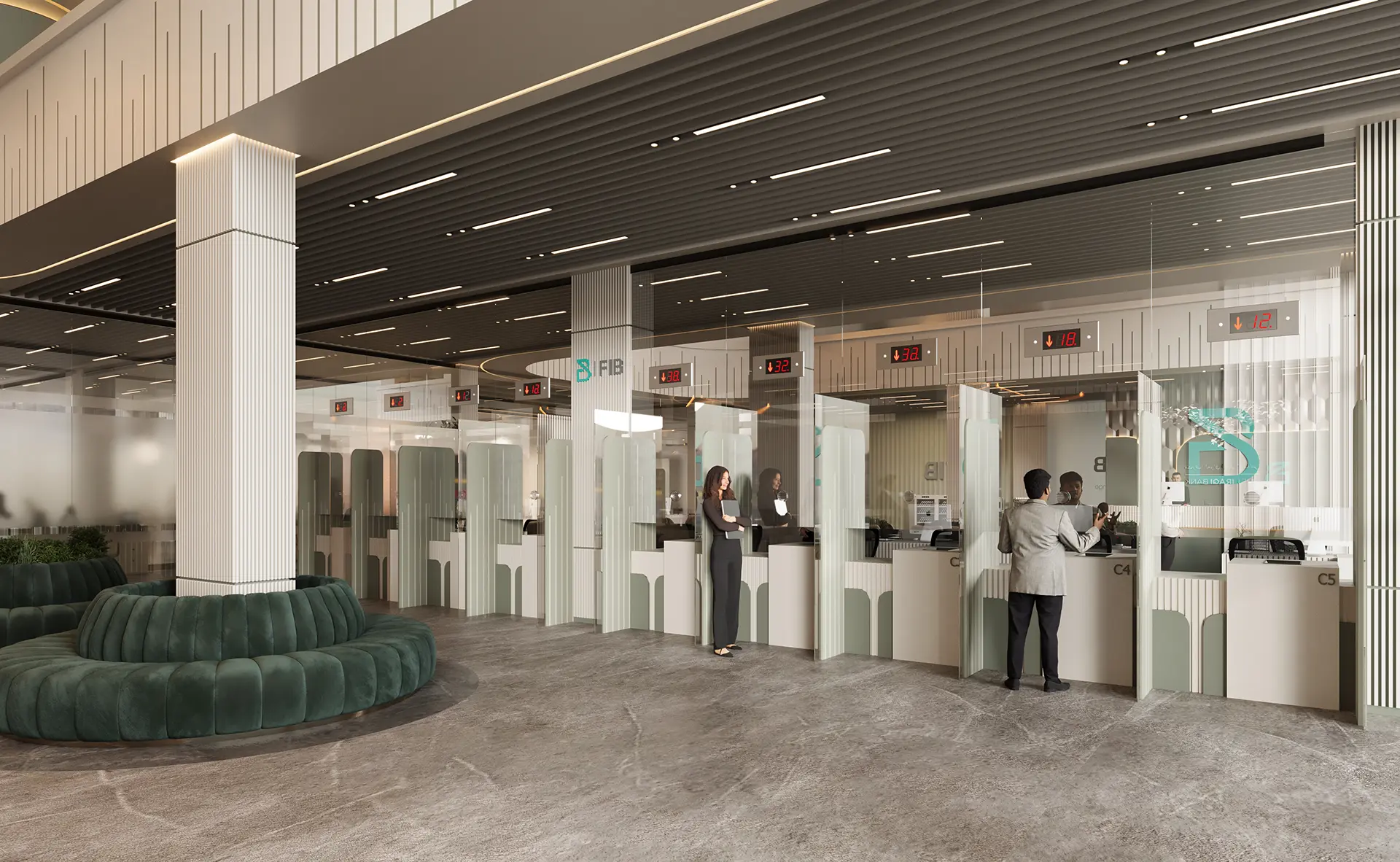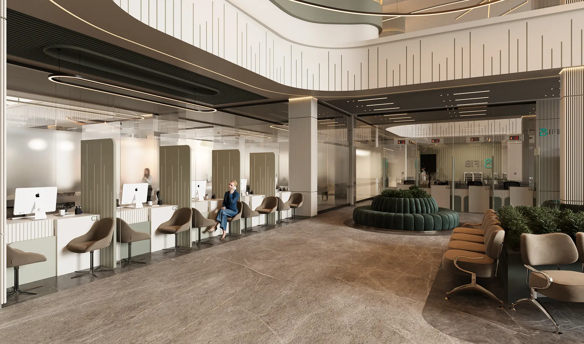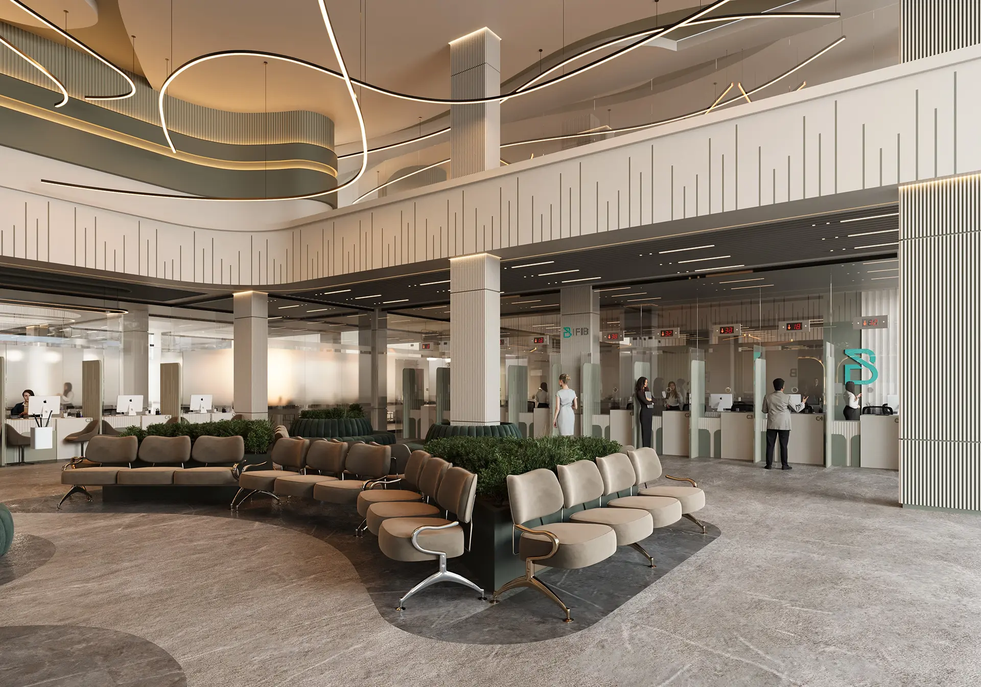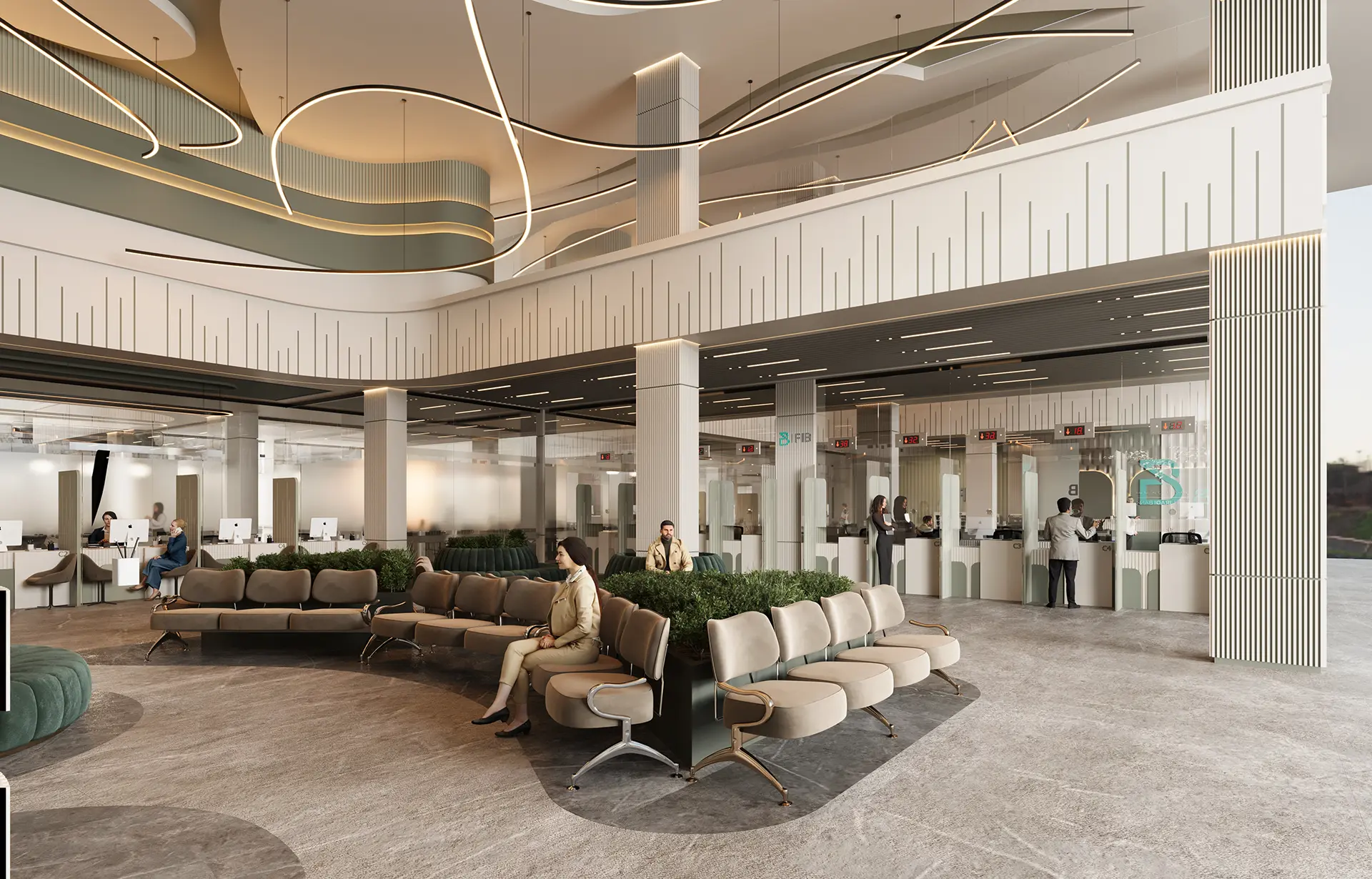 The exterior design of the bank presents a modern and inviting facade, while the interior spaces are meticulously planned to enhance the banking experience, featuring high-quality materials, innovative lighting, and a layout that promotes both efficiency and comfort.